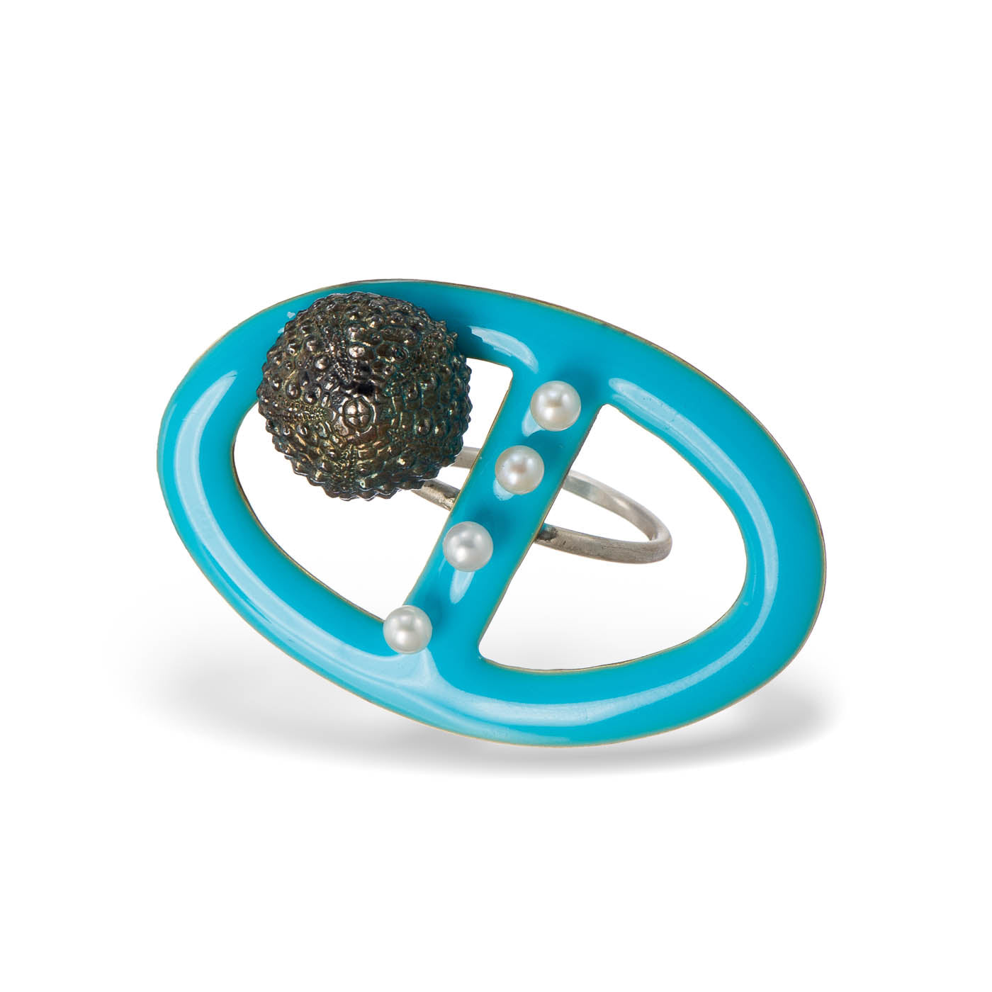 Urchin is made of silver 925 & is rainbow patina plated. The lower side of the ring is made of silver 925. The upper side is made of brass coated with enamel and cultivated pearls are placed on it.